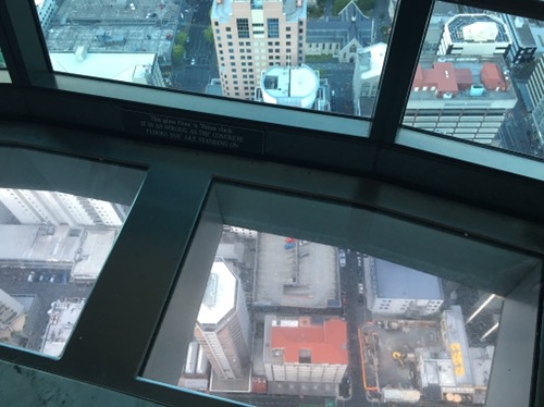 Die Fahrt auf dem Skytower war genial in dem Aufzug mit einem Stück Glasboden. Auch auf der Aussichtsplattform in 155 m Höhe waren Glaselemente im Boden, über die man Laufen konnte. Marian störte das gar nicht, er hüpfte munter darüber. Wir gingen mit gemischten Gefühlen und manche Leute hielten sich sehr starr an den Geländern recht und links beim darüber laufen fest. Das war sehr lustig zu beobachten.