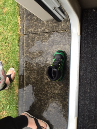 So waren unsere zwar unter dem Wohnmobil zum „Auslüften“ abgestellten Schuhe wieder duftend, aber auch bis oben hin mit Wasser gefüllt. Das Wasser, dass in den Ritzen der Seitentür abläuft, sammelte sich nämlich genau unterhalb des Schuhabstellplatzes. Aber mit viel Küchenrolle ausgestopft werden sie nun langsam wieder etwas trocken.