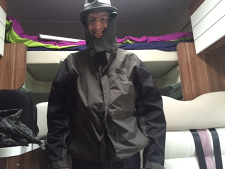 Nach einem ausgiebigen Mittagsschlaf haben wir beschlossen zu Fuß zum Einkaufen zu laufen trotz des immer noch anhaltenden Regens und enormen Windes um ein paar Besorgungen zu erledigen. Marian startete mit Regenhose und Regenjacke, wir auch mit unseren Outdoorjacken. Nach kürzester Zeit sind wir total durchgeweicht gewesen und der Weg war durch den Sturm furchtbar anstrengend, aber ein Erlebnis für sich. Nach dem Einkauf gingen wir dann nass und barfuß wieder zum Campingplatz zurück. Aber das war uns noch nicht verrückt genug. Ein Abstecher in den Pool war auch noch Pflicht. Das war herrlich und Marian ist toll geschwommen und gerutscht.