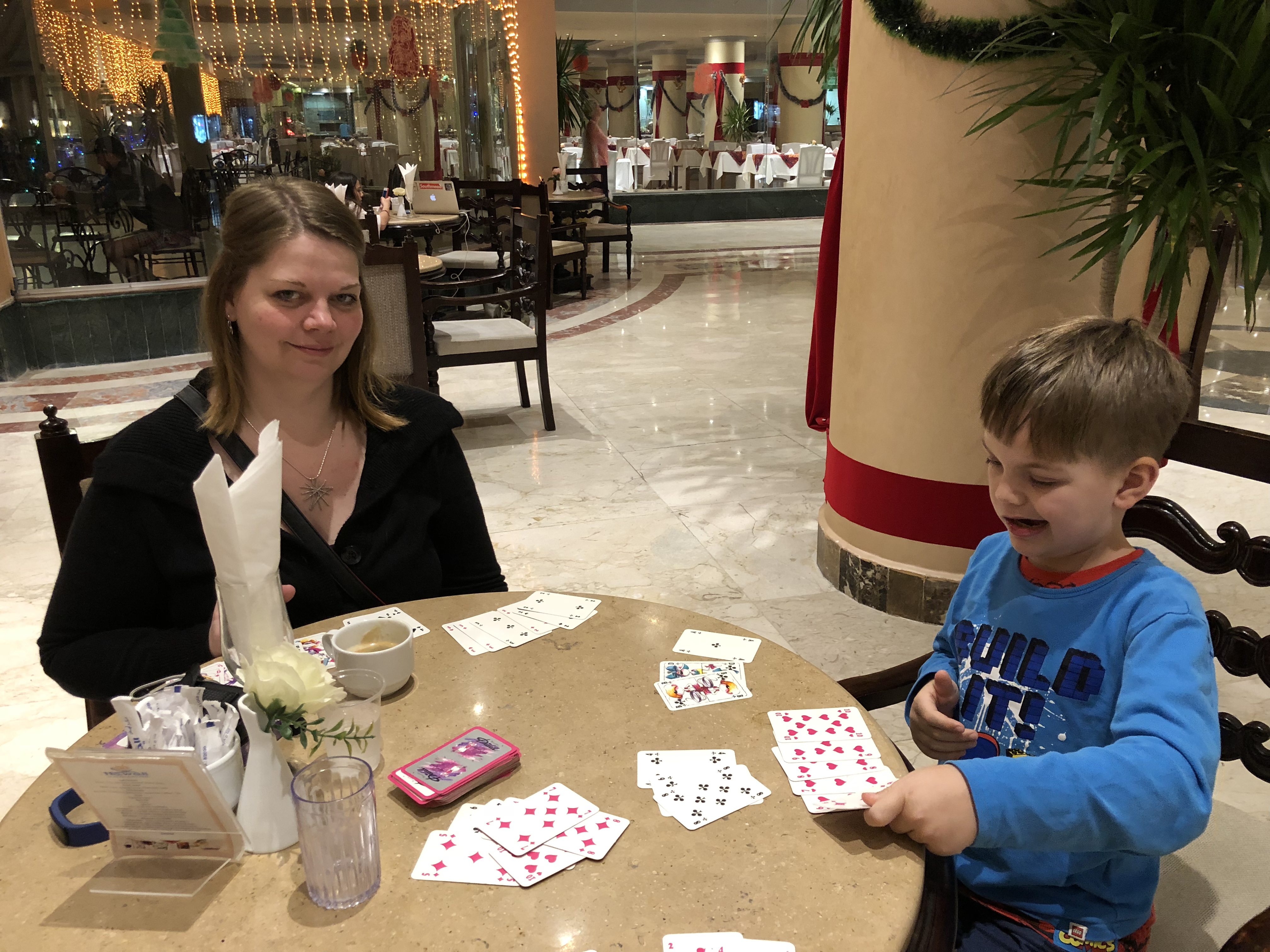 In Hurghada lief dann alles wirklich reibungslos ab und nach einer sehr schnellen Passkontrolle und Kofferrückgabe saßen wir innerhalb kürzester Zeit im Bus zu unserem Hotel. Dann gab es noch einen kurzen Snack im Restaurant und einen kurzes Kartenspiel an der Bar. Marian und ich tranken um die Wette alkoholfreie Cocktails und lagen innerhalb kürzester Zeit unter dem Tisch, während sich unser armer Papa mit Bier und Ouzo begnügen musste.
