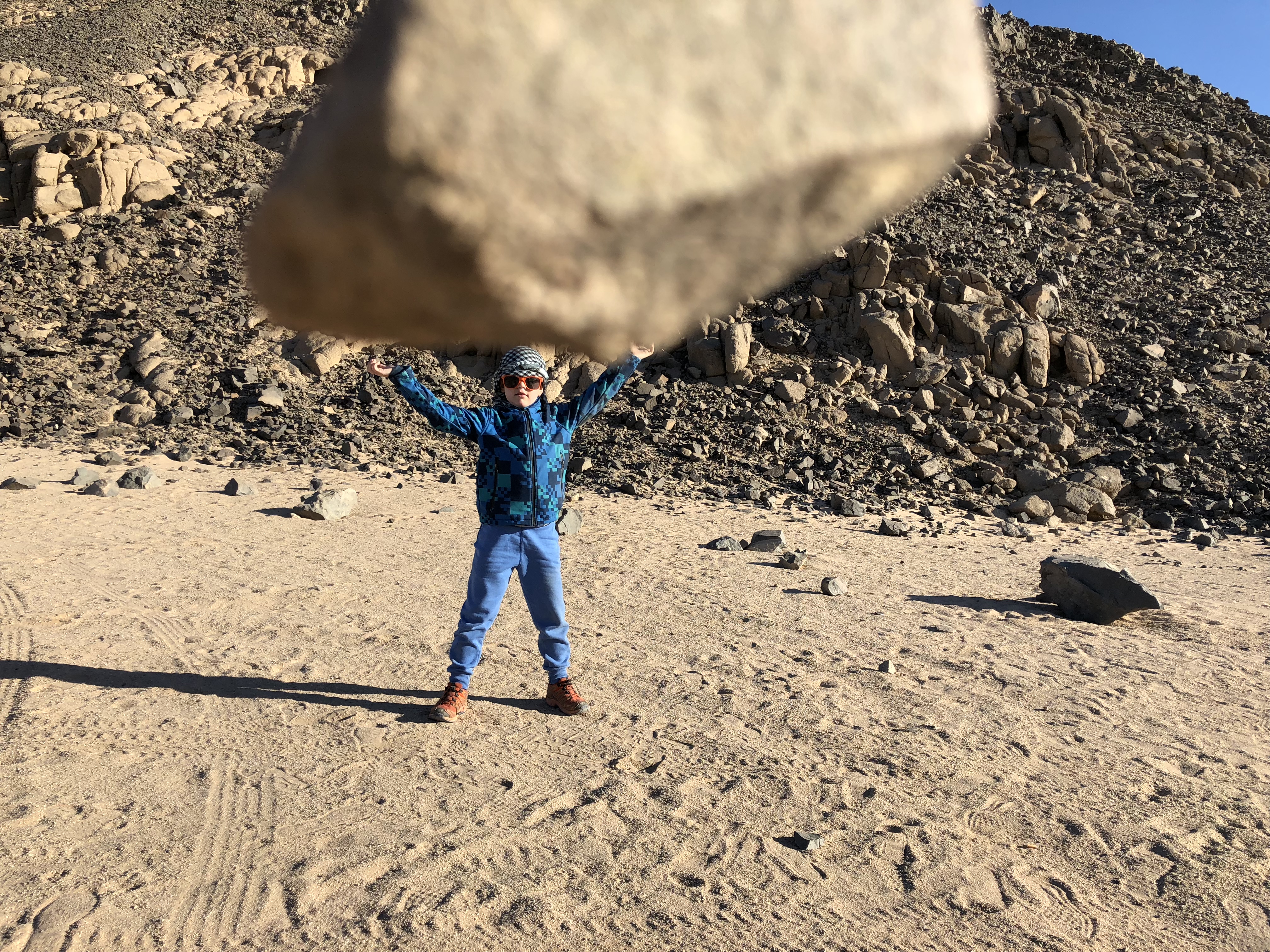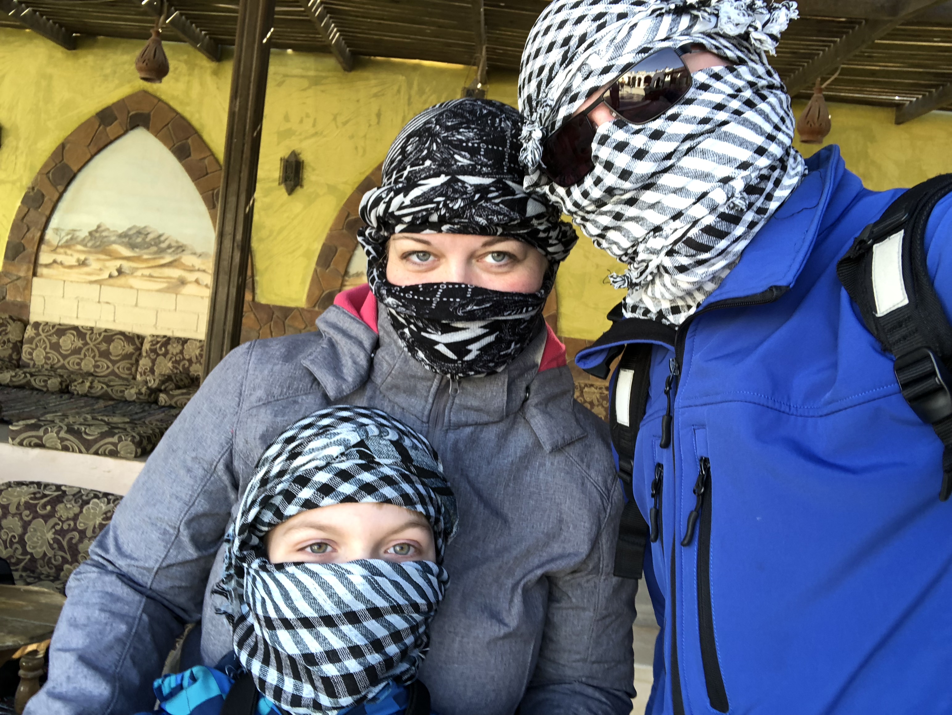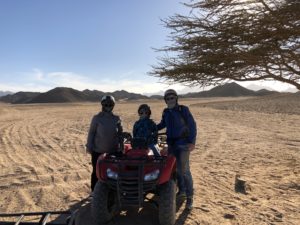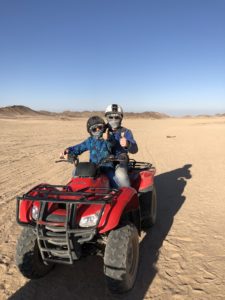 In einem Beduinendorf tranken wir Tee und konnten Tiere bestaunen. (Ergänzung: mehr leere Käfige, als Lebendige Tiere). Nach einem kurzen Kamelritt gab es dann ein kleines Barbecue und im Anschluss fuhren wir im Stockdunkeln quer durch die Wüste mit den Quads wieder zum Ausgangspunkt zurück. Ein wirklich toller Trip. Wir waren froh, dass wir uns so reingekuschelt hatten, denn die Rückfahrt war wirklich sehr kalt. Während der Busfahrt zum Hotel schlief Marian ein. Und da wollten wir doch noch groß Party machen. 😉