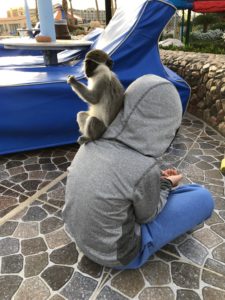 Nach zwei Stunden im Pool wärmten wir uns unter der warmen Dusche aus und aßen anschließend gemütlich zu Mittag. Nach einem kurzen Schläfchen konnten wir Marian in einen speziellen Anzug an eine Wand kleben. Das besagte Foto kennt ihr ja schon. Auch sein kleines Erlebnis mit dem Äffchen Max. Und nein, seine Eltern haben nicht das Foto gemacht!!!! Aber es gibt natürlich auch eine Affenmama und einen Affenpapa, die passen nur leider nicht durch das Käfiggitter und konnten so dem Gruppenbild nicht beiwohnen.